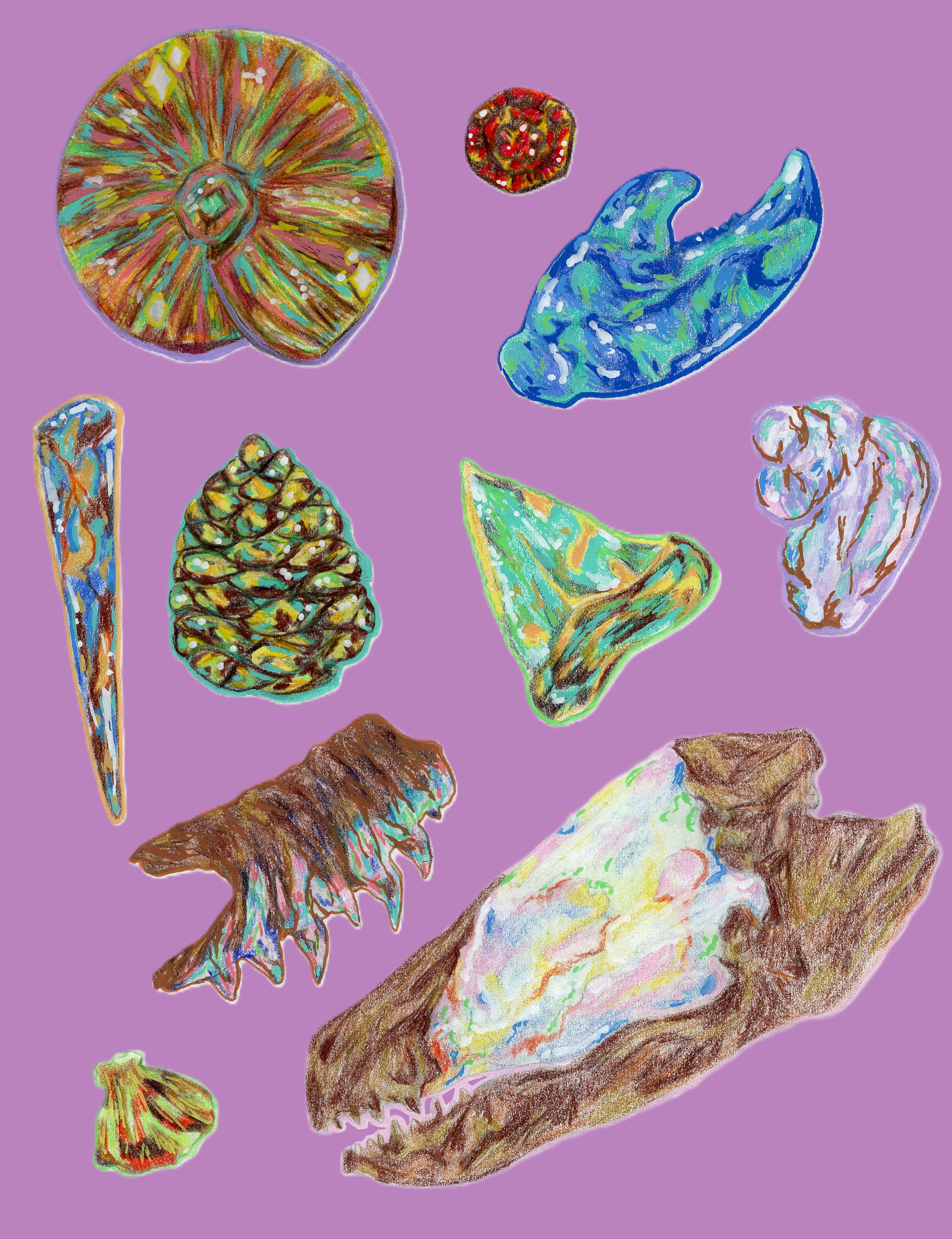 The opal fossil collection is officially complete, and it feels like the perfect finale to a wonderfully iridescent week. Diving into the world of opalization—how it forms, why it happens, and which ancient creatures have been transformed into shimmering gemstones—has been such a rewarding rabbit hole. The art that came out of this theme might be some of my favorite yet. The Dunkleosteus especially turned out stunning, and every fossil illustration from this series has its own little glow.